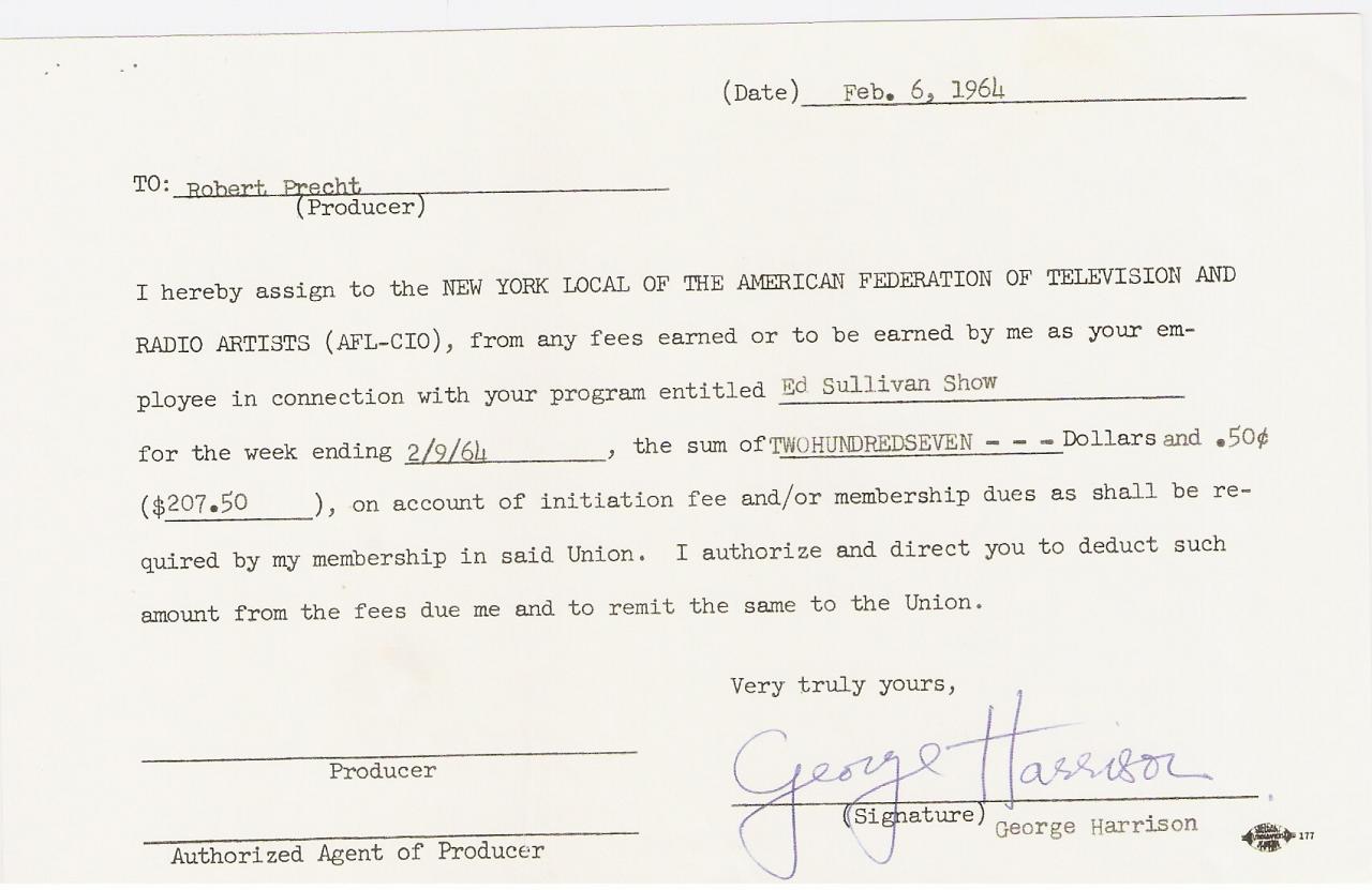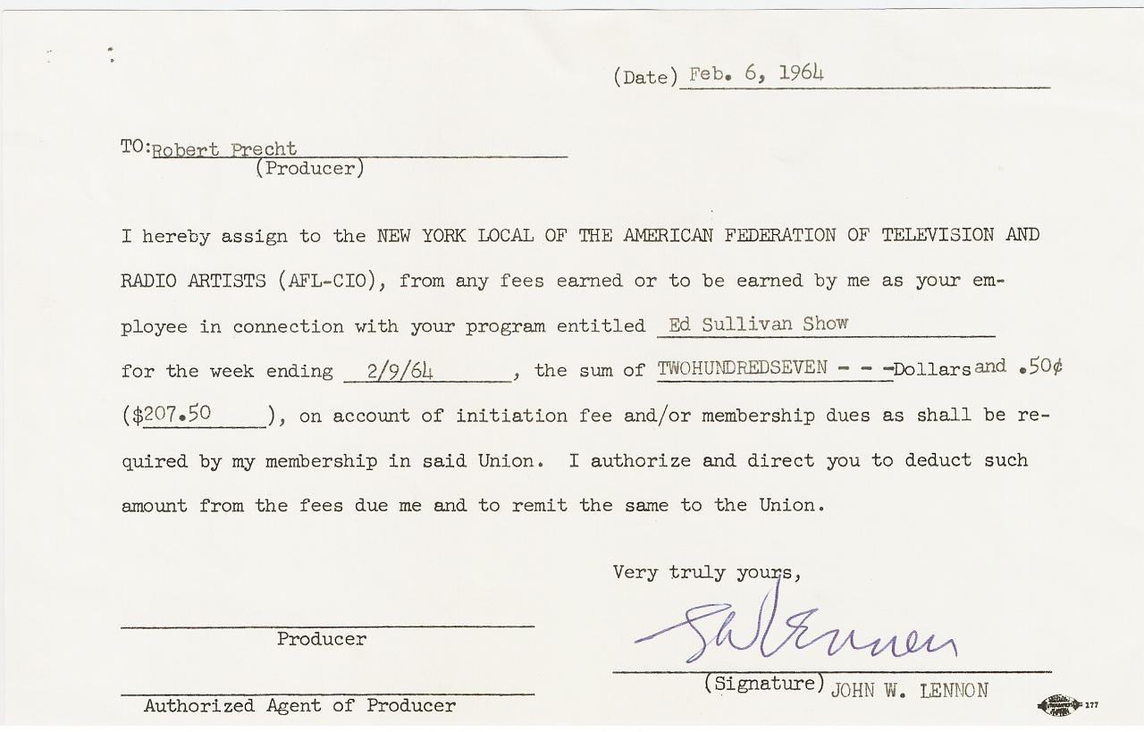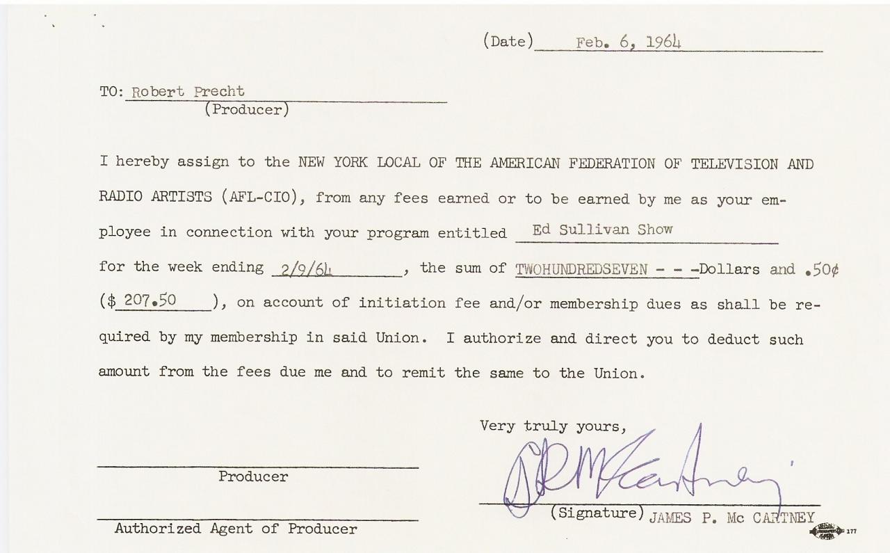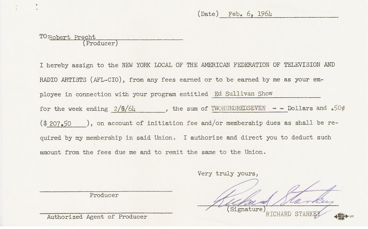 “To Robert Precht, I hereby assign to the New York Local of the American Federation of the Television and Radio Artists (AFL-CIO), from any fees earned or to be earned by me as your employee in connection with your program entitiled Ed Sulllivan Show for the week ending in 2/9/64, the sum of Two hundred seven dlollars and .50 cents $207.50 on account of initiation fee and or membership dues as shall be required by my membership in said Union. I authorize and direct you to deduct such amount from the fees due me and to remit the same to the Union. Very truly yours, –”