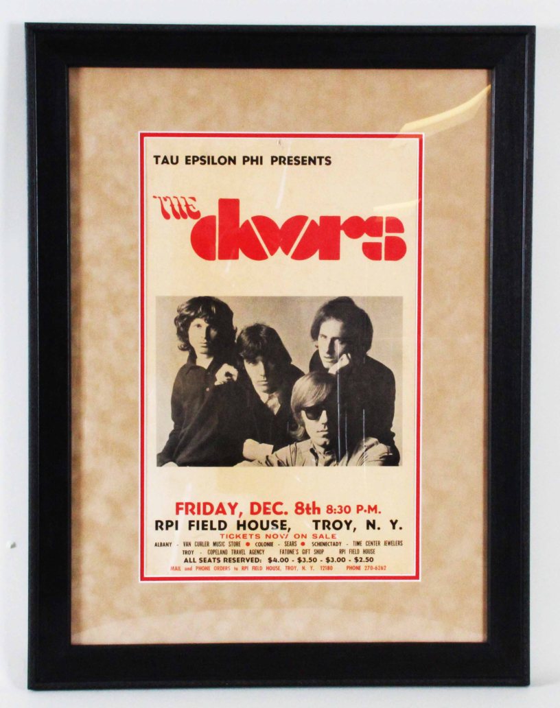Home / Shop / Entertainment / More Collectibles / The Doors Poster Original Dec. 8, 1967 R.P.I. Field House Troy, NY Concert Tau Epsilon PhiThe Doors pulled people in with an intoxicating sound, and the mesmerizing sound of Jim Morrison. It was poetic really. The band formed in Los Angeles in 1965 and were one of the most controversial acts going because Morrison kept the audience in a spell of wild lyrics and stage presence. Their arrival marked a string of classic hit singles and albums and a new found symbiotic dark and mysterious relationship with their audience unlike their predecessors (think, peace and love).